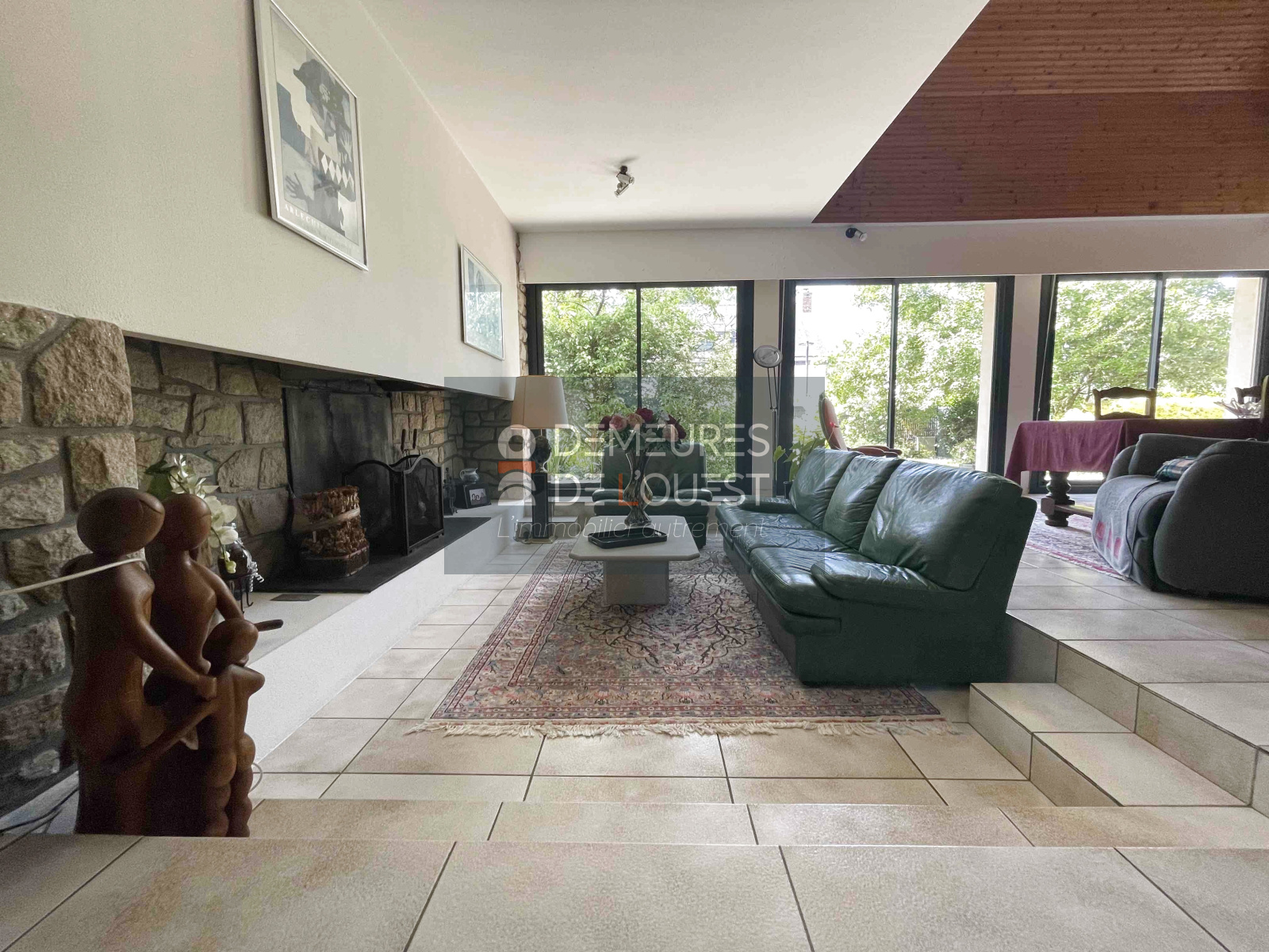 Cette superbe pièce de vie avec cheminée et pierres apparentes offre lumière, espace et vue sur la végétation.