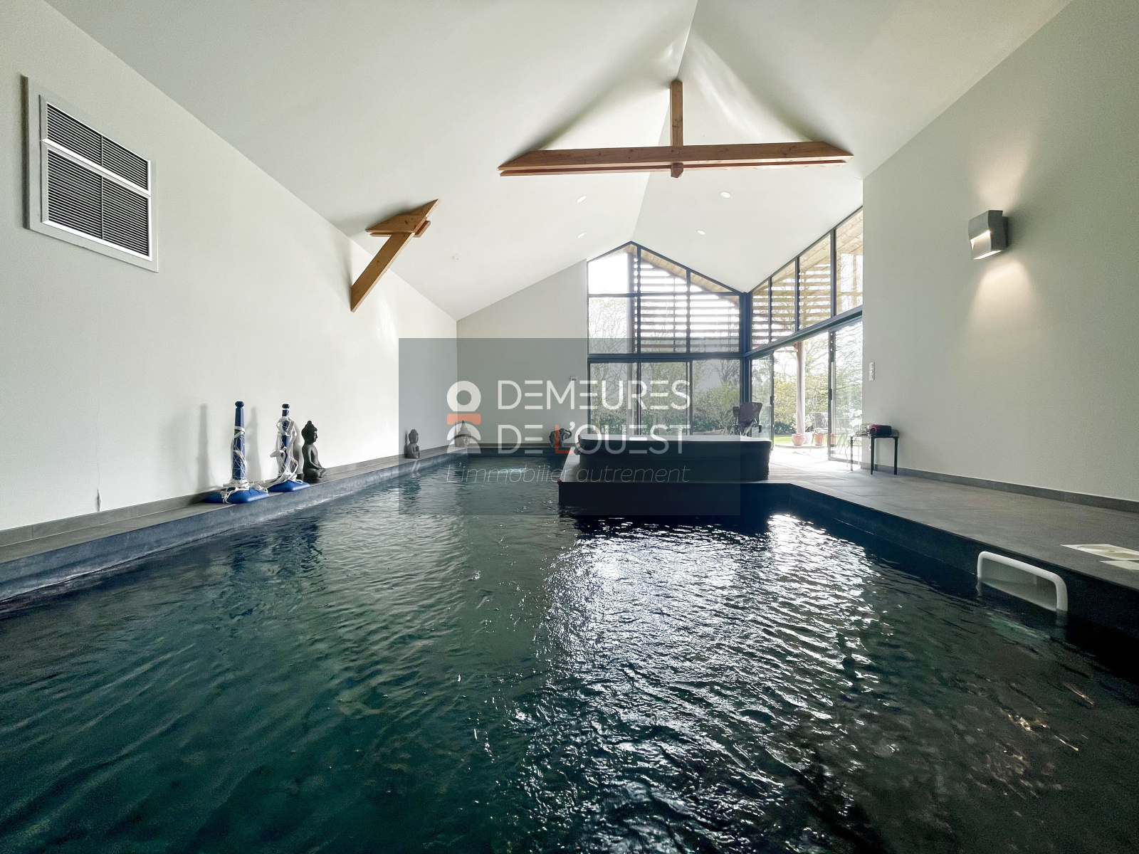 "Une Oasis de Détente Privée". Le luxe se prolonge à l'extérieur avec un patio abrité, parfait pour vos dîners d'été. Mais le véritable atout de cette demeure réside dans son espace bien-être de 95 m² : une piscine intérieure chauffée, accompagnée de sa douche et son WC, vous permettant de profiter des joies de la baignade en toute saison, quel que soit le temps breton.