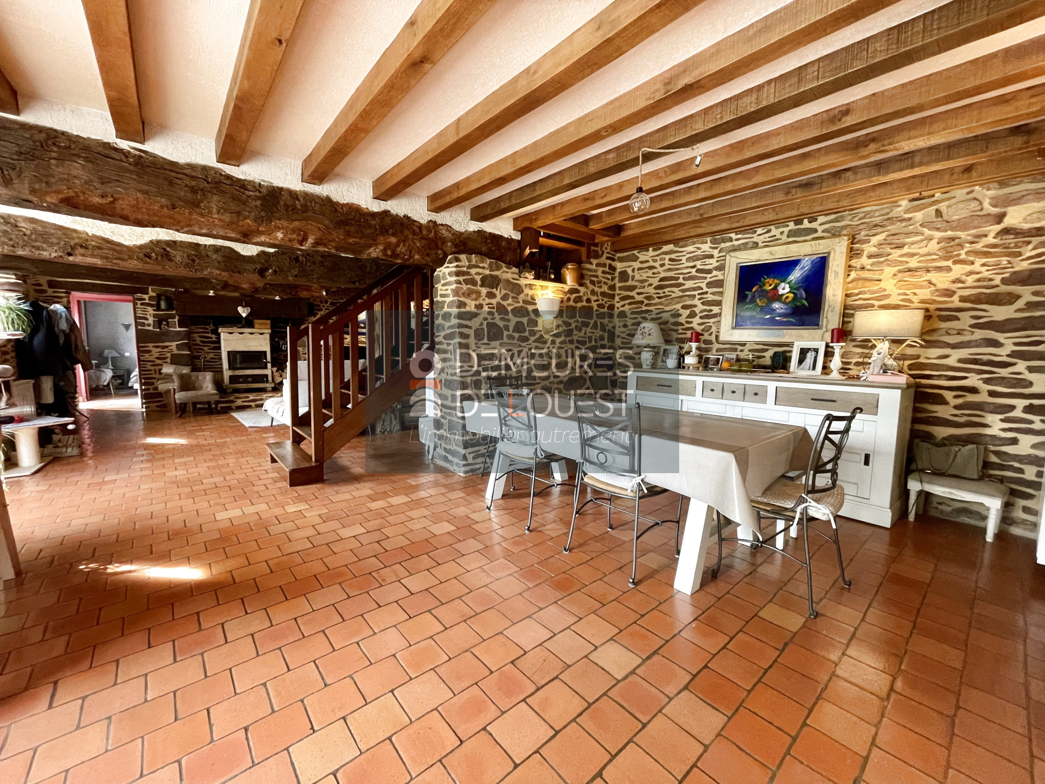 Dès l'entrée, l'espace et la clarté s'imposent. Le rez-de-chaussée dévoile une pièce de vie magistrale de près de 60 m², véritable cœur de la maison où bois et pierres se marient avec élégance. Une cuisine indépendante et spacieuse de 18 m² invite à la convivialité. Ce niveau dispose également d'une chambre confortable, d'une salle d’eau, ainsi que d'espaces fonctionnels (lingerie et local technique).